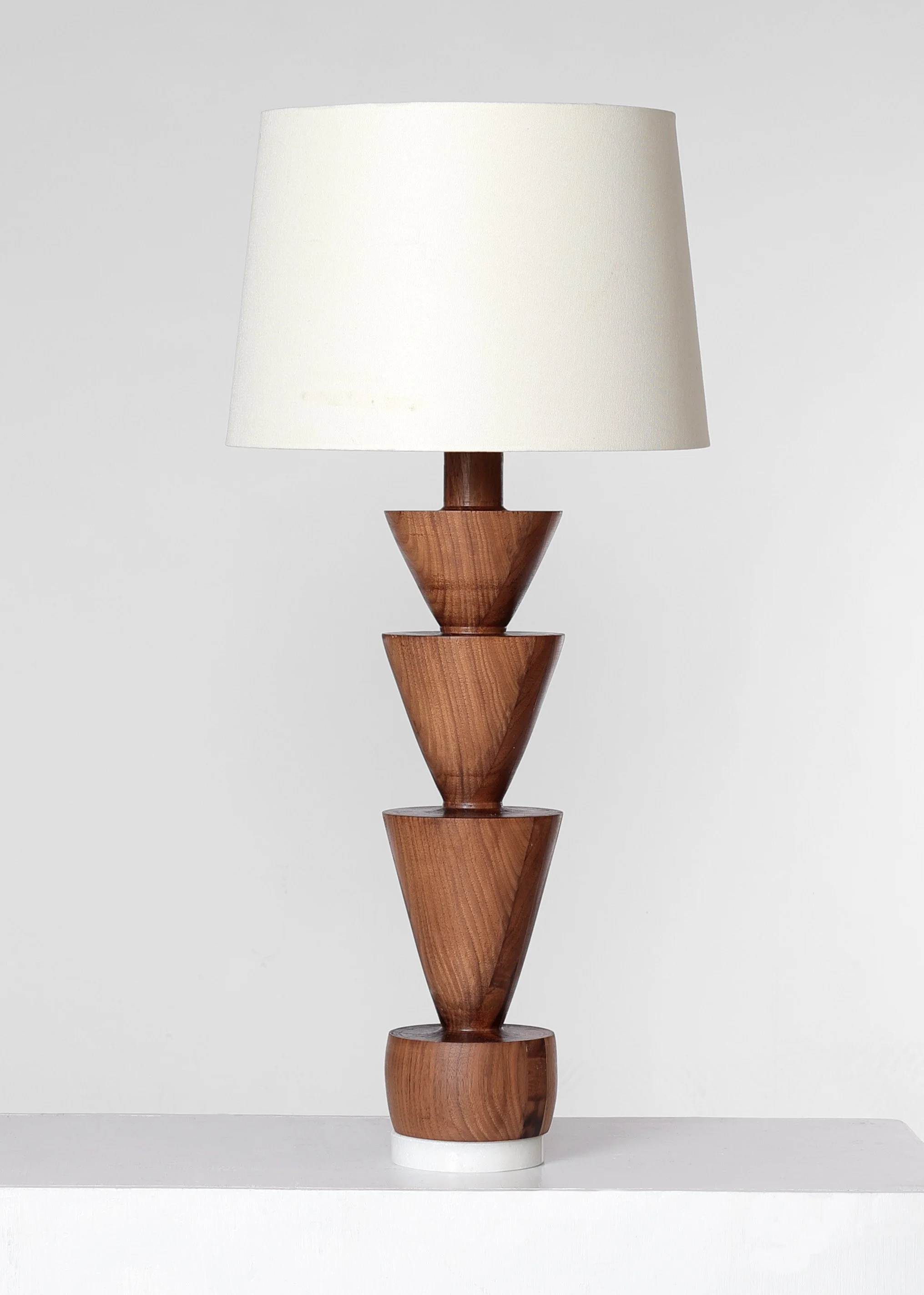 Lathe turned by hand. Custom sizes and wood species available. Lamp shade not included.